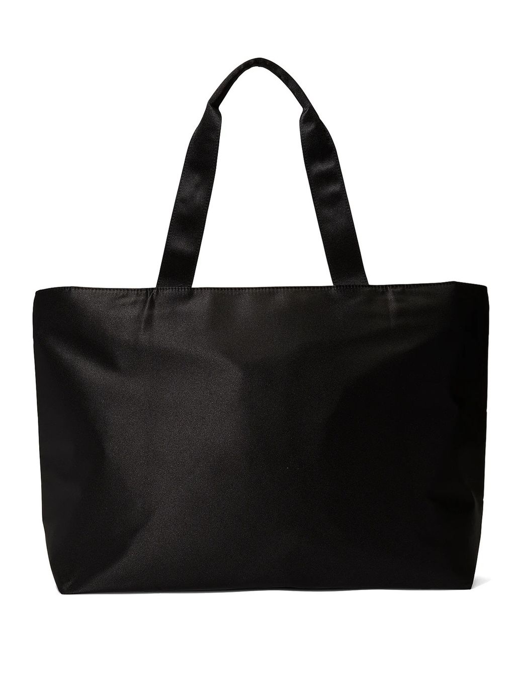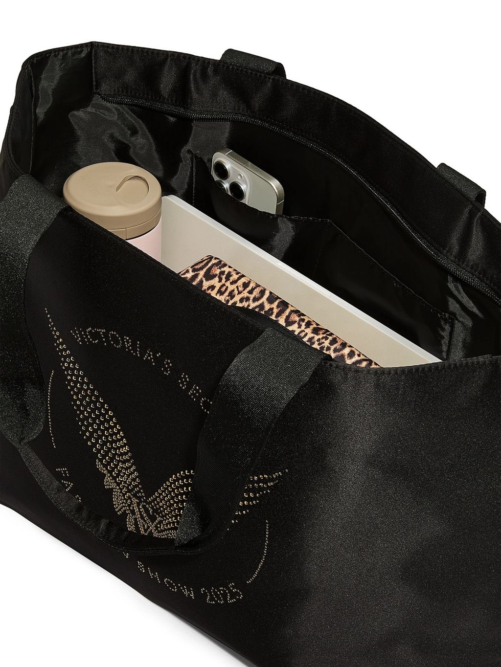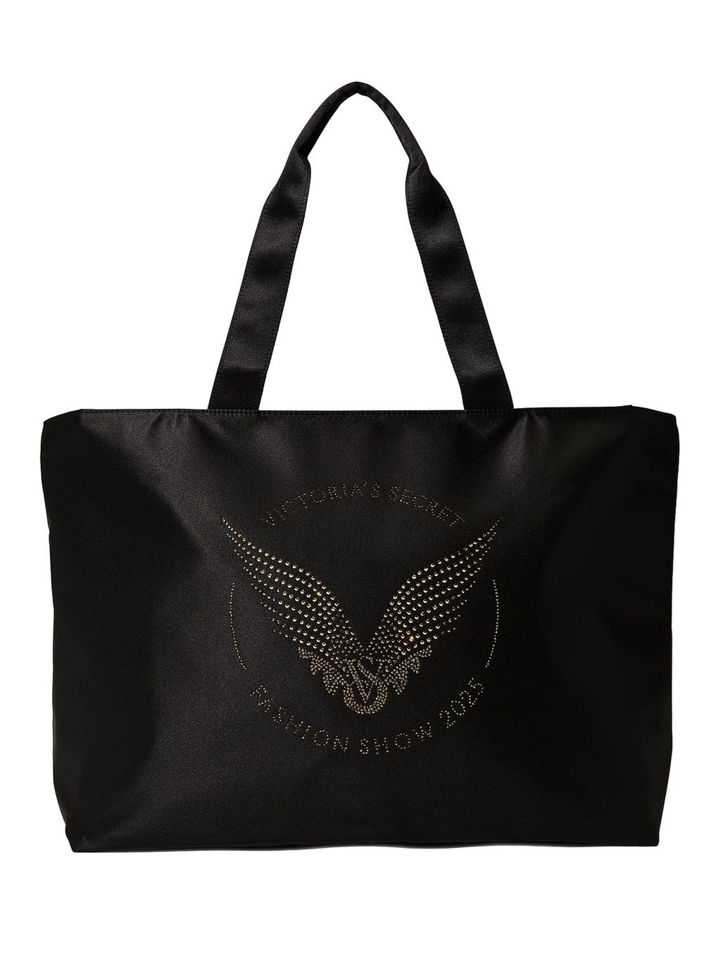 Runway ready. Celebrate your favorite fashion event with this chic and stylish Tote Bag. Rhinestone VS Angel Wings add a glittering touch to this sleek black style.