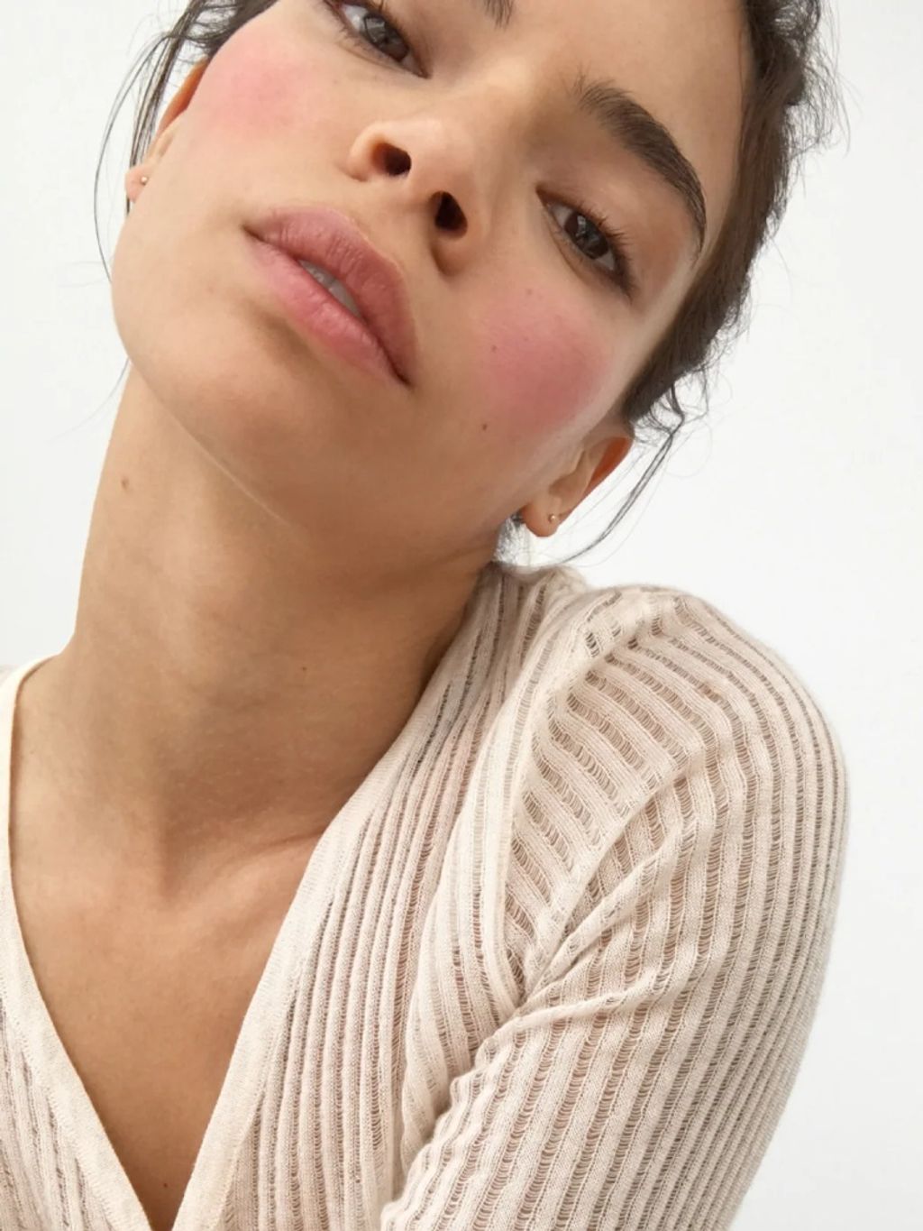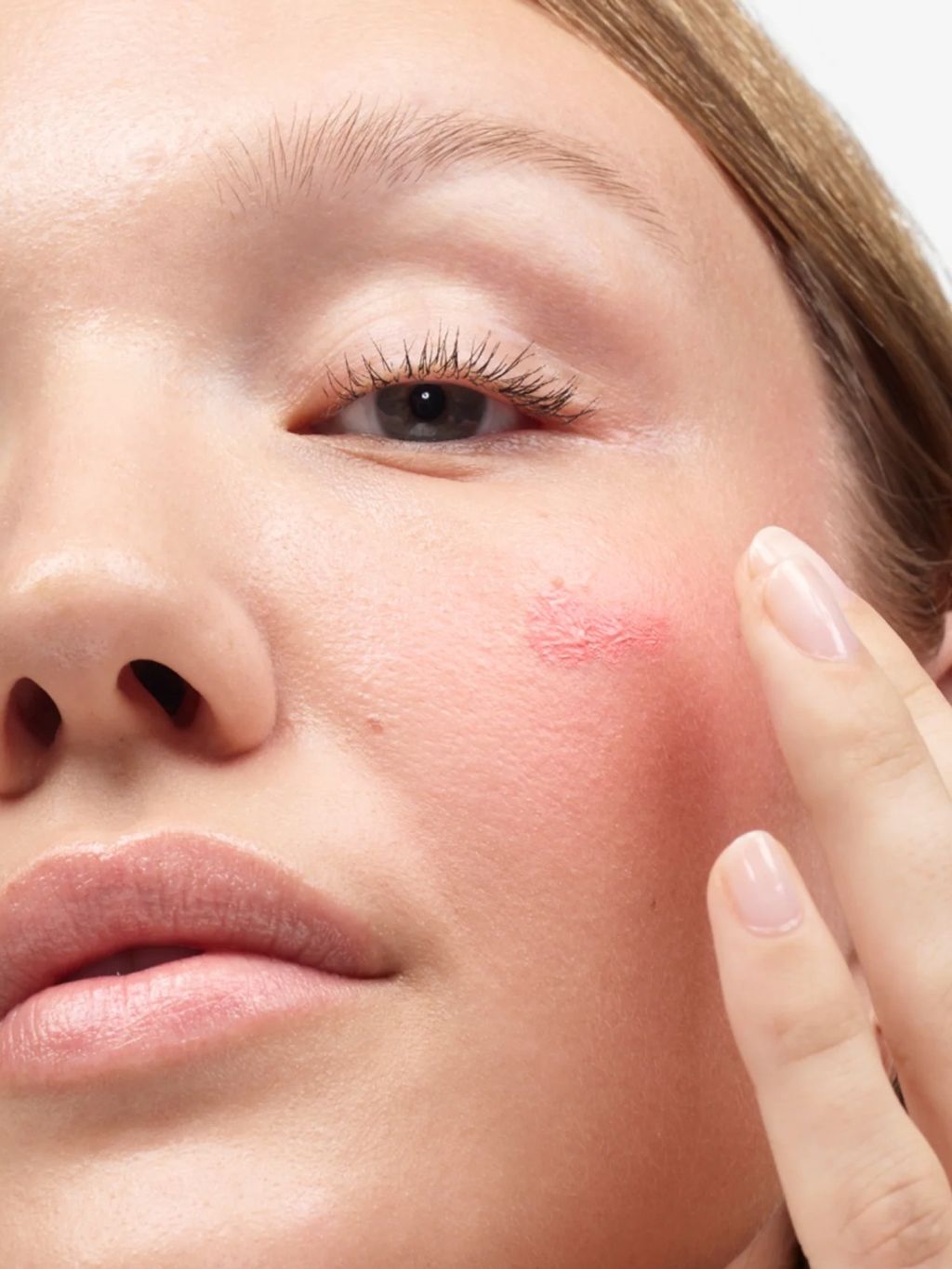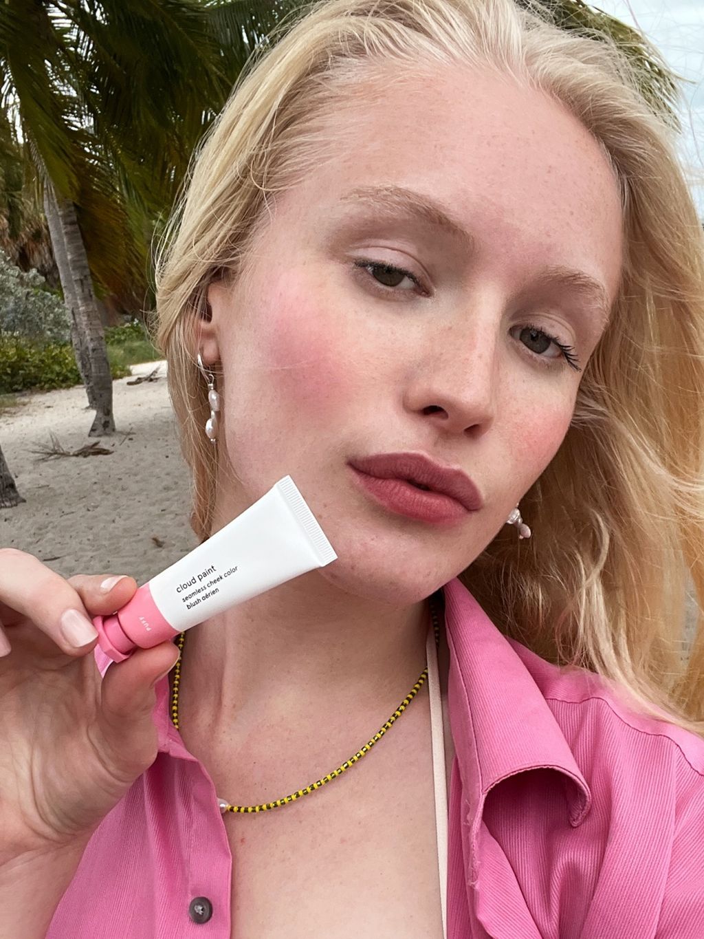 - Gently squeeze a tiny dot onto your finger. Dab onto the apples of your cheeks first, and then blend up and out.