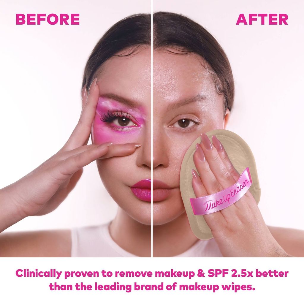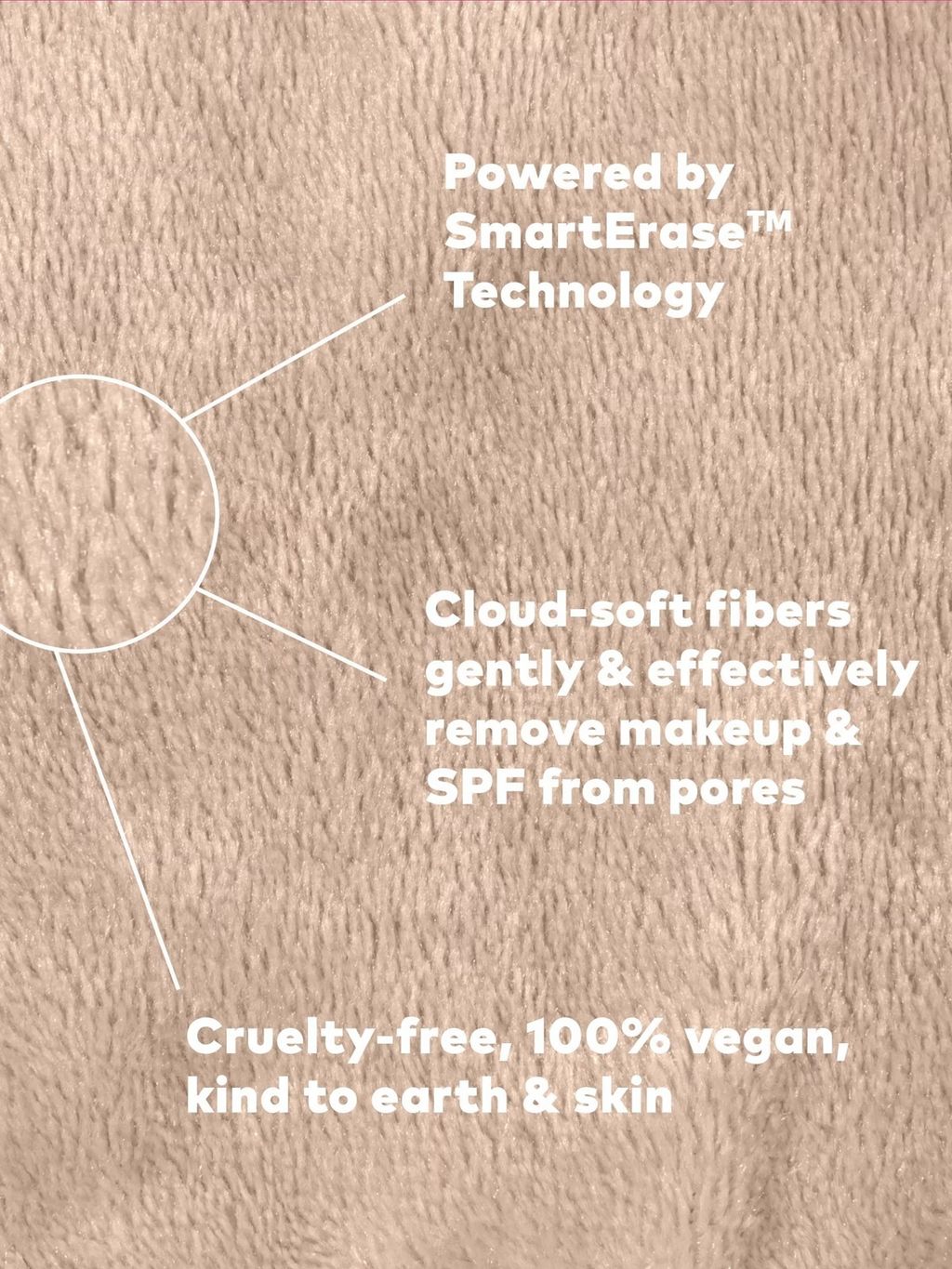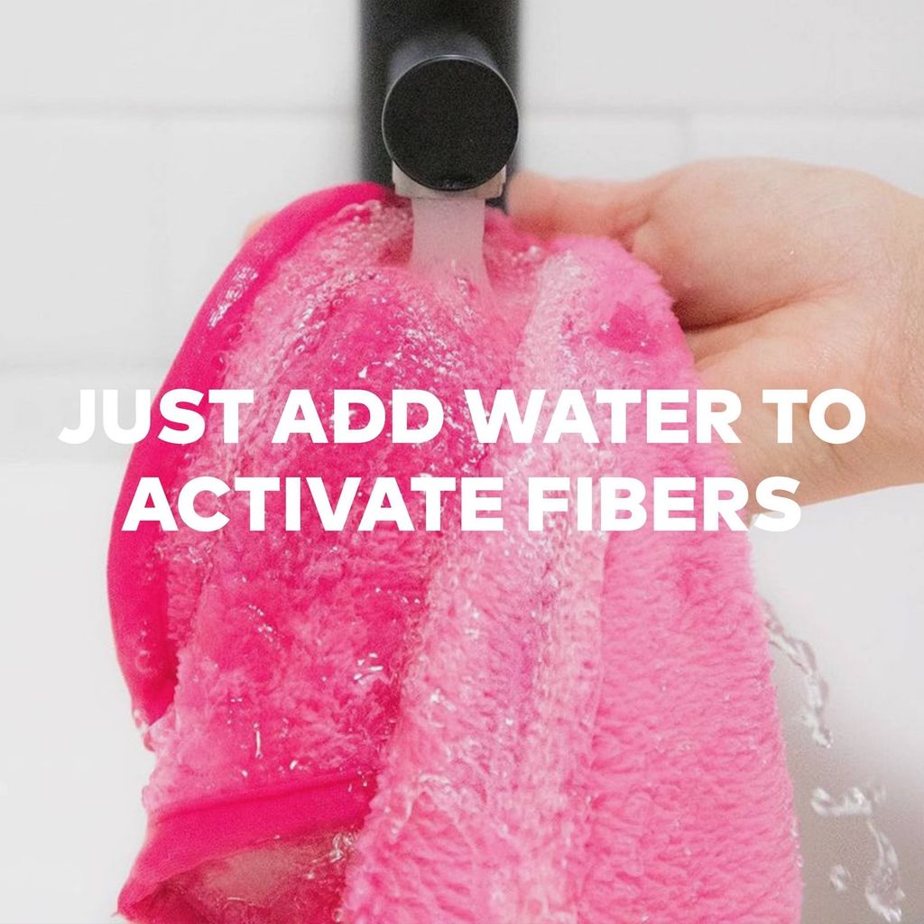 Erase all makeup with JUST WATER™ including waterproof. Our patented, water-activated, cloud-soft fibers gently & easily remove all makeup & sunscreen from pores. 2 in 1 benefit: one side erases makeup & one side exfoliates skin.