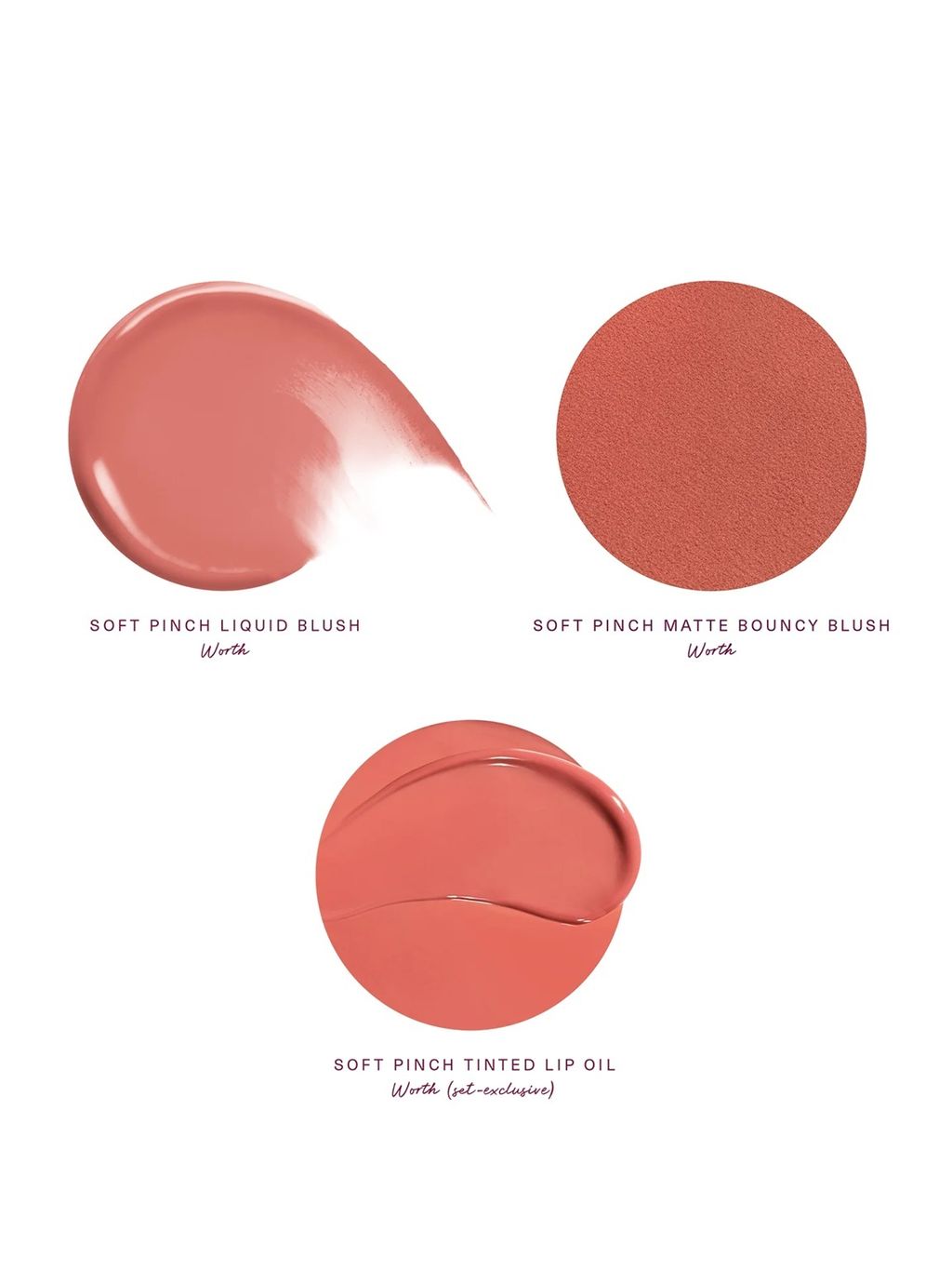 Three Soft Pinch essentials in one travel-ready set, with a full-size Soft Pinch Matte Bouncy Blush, a Soft Pinch Liquid Blush Mini, and a set-exclusive Soft Pinch Tinted Lip Oil Mini—all in bestselling shade Worth (true rose).