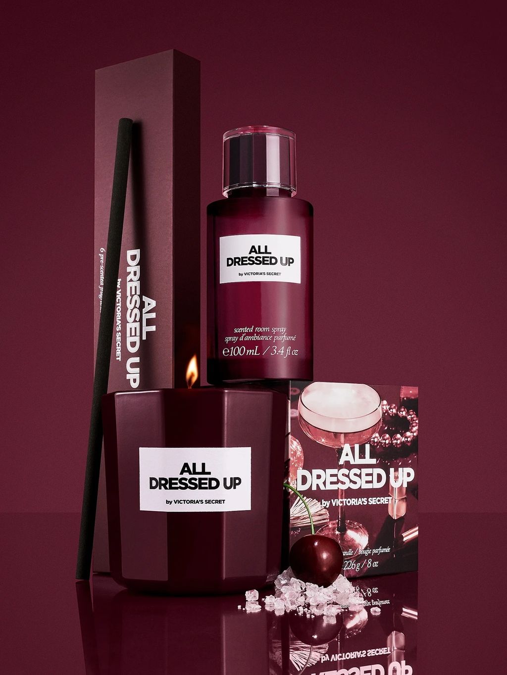 Flirty, fun, and a little boozy, All Dressed Up charms everyone. It opens with a luscious wave of cherries, golden amber, and softly smoked woods. An intriguing, powdery lipstick note adds a pinch of glamorous movie-star magic. It’s the unique essence of perfume, rouge, and cocktails that you leave in your wake as you head out the door for the best night ever.