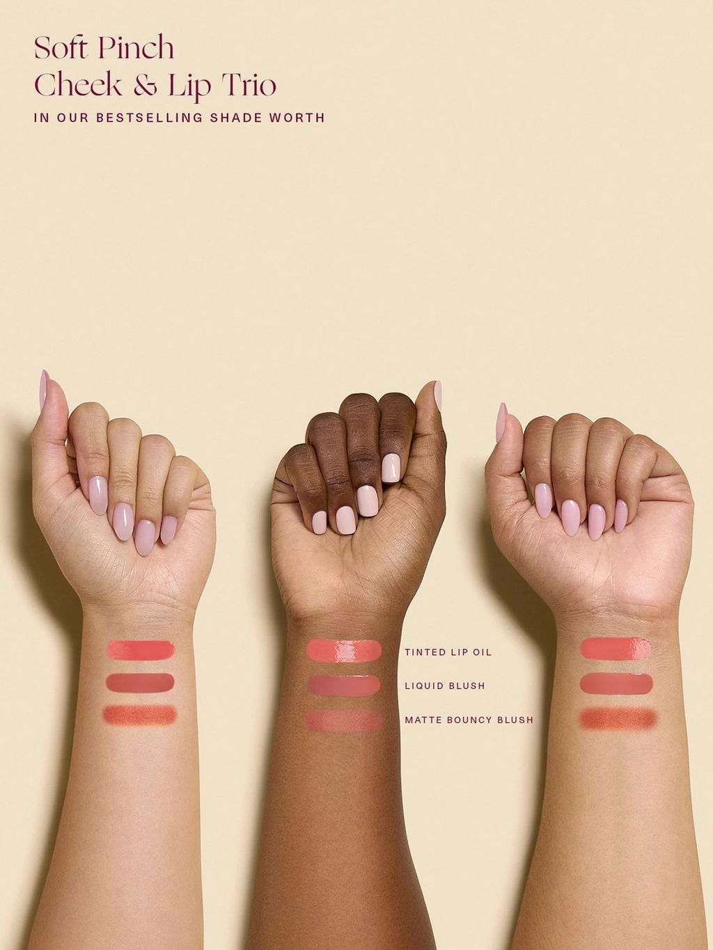 Three Soft Pinch essentials in one travel-ready set, with a full-size Soft Pinch Matte Bouncy Blush, a Soft Pinch Liquid Blush Mini, and a set-exclusive Soft Pinch Tinted Lip Oil Mini—all in bestselling shade Worth (true rose).
