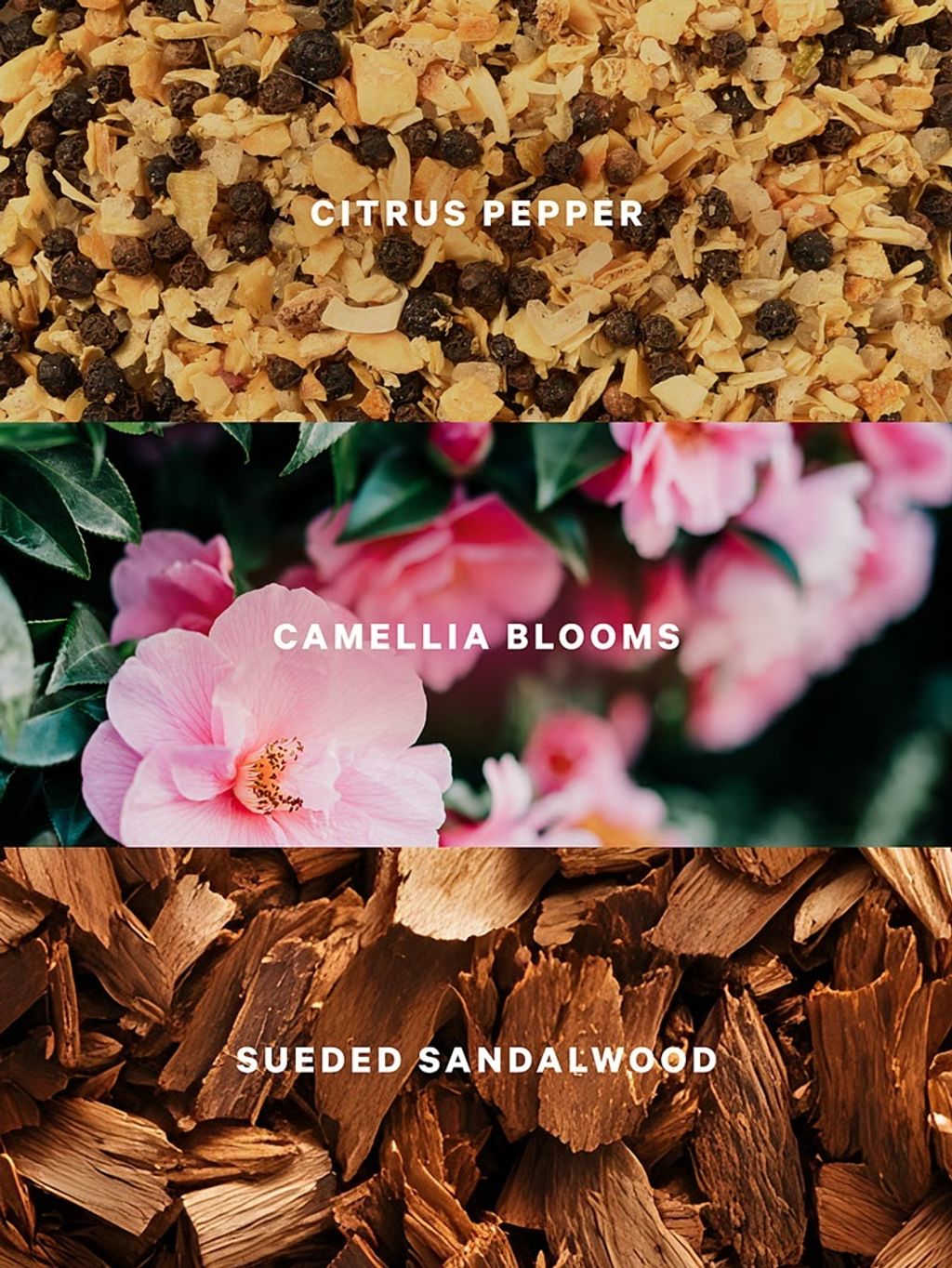 • Notes: Citrus Pepper, Camellia Blooms, Sueded Sandalwood