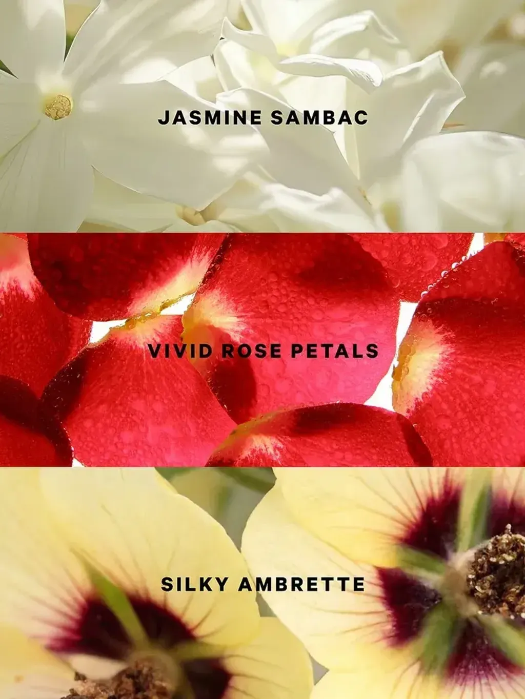 - Notes: vivid rose petals, jasmine sambac, silky ambrette