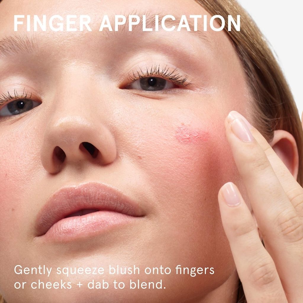 - Gently squeeze a tiny dot onto your finger. Dab onto the apples of your cheeks first, and then blend up and out.