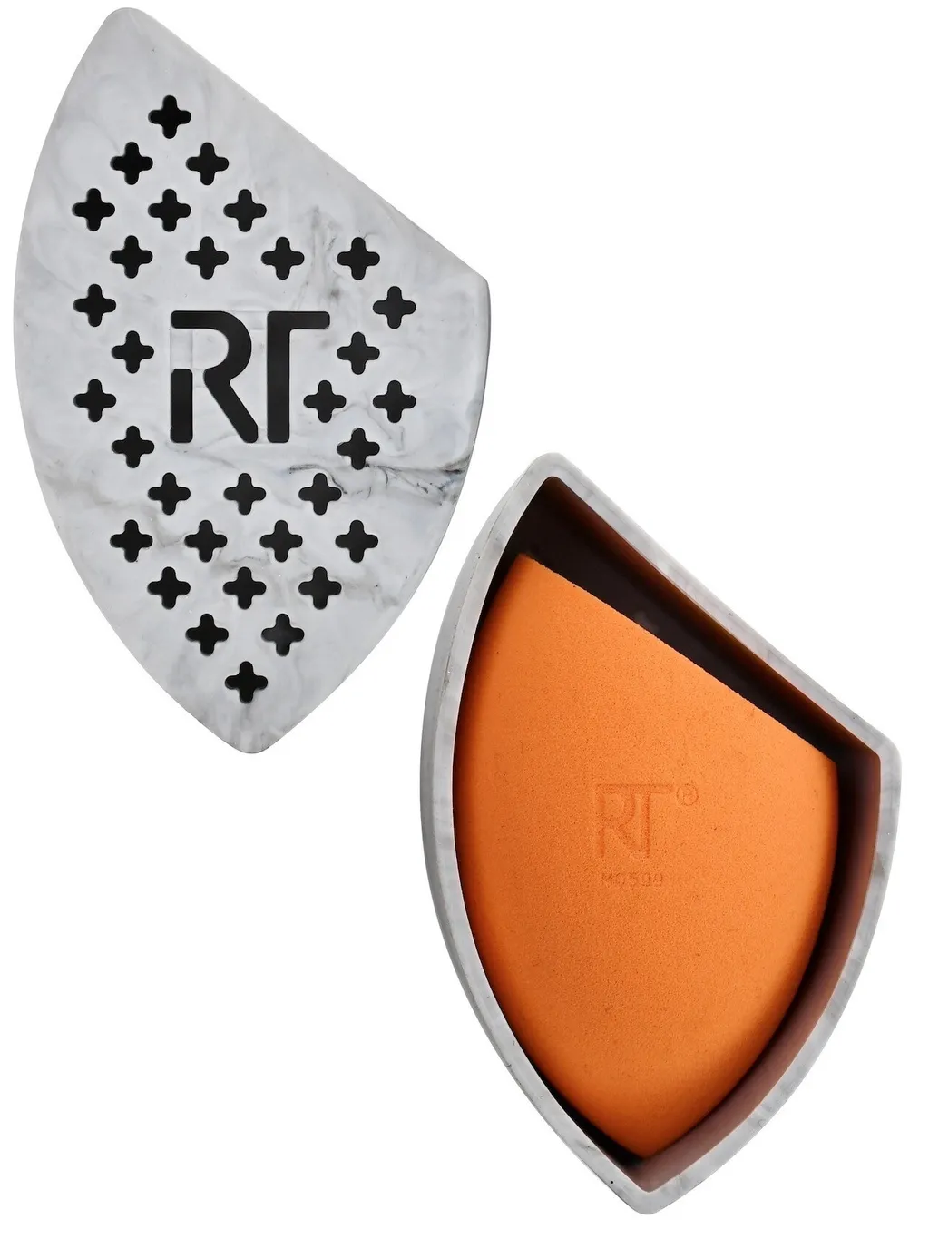 Shatter-resistant silicone keeps your miracle complexion sponge clean + protected in your makeup bag or drawer