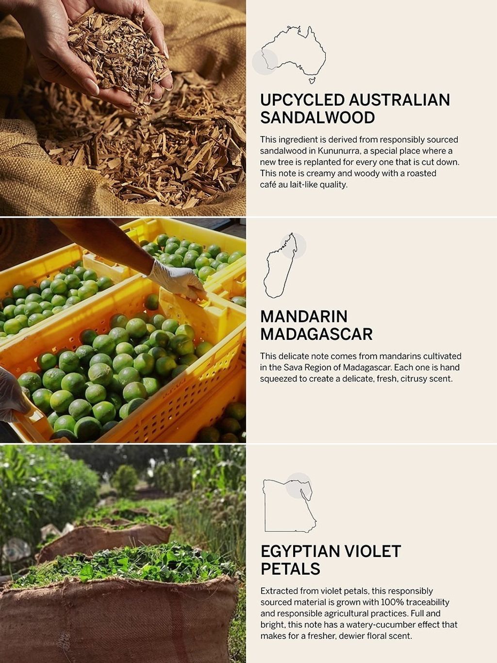 • Notes: Australian sandalwood, mandarin Madagascar, Egyptian violet