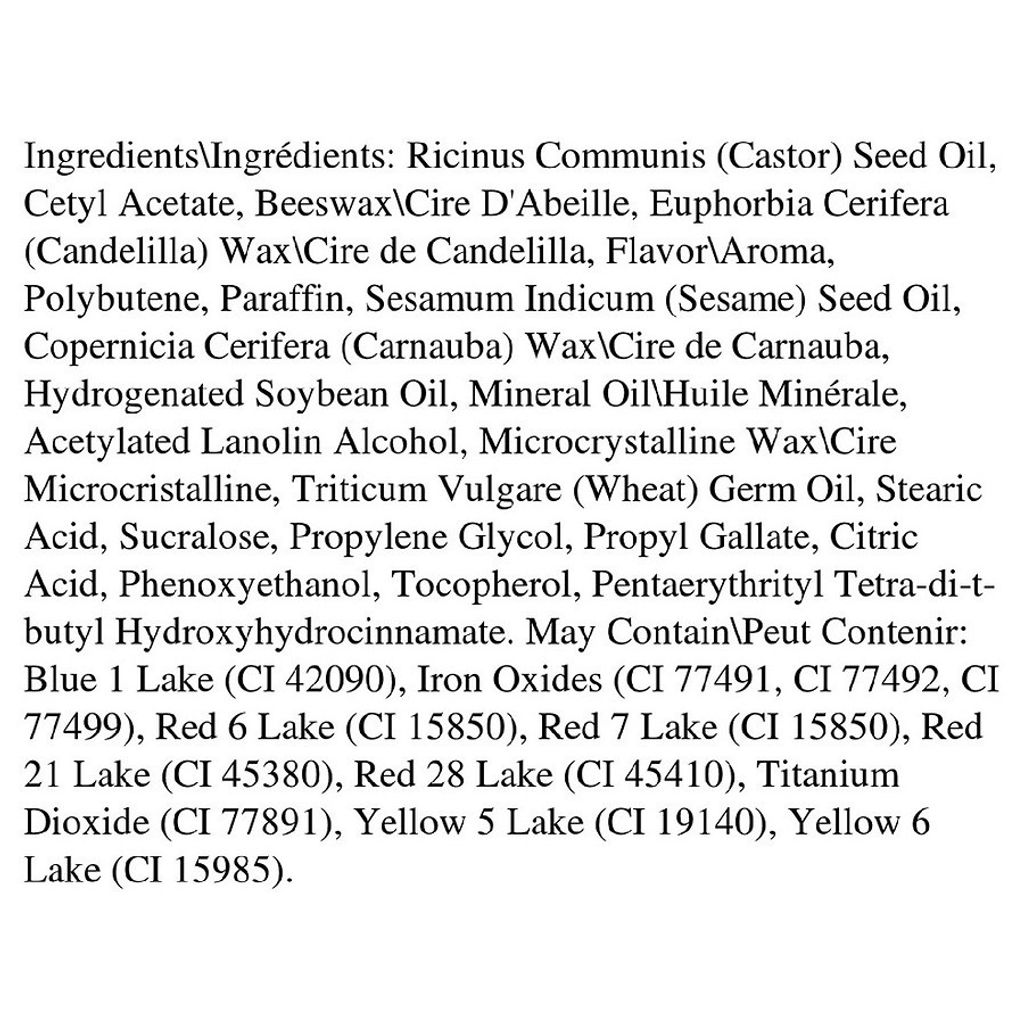 Ricinus Communis (Castor) Seed Oil, Cetyl Acetate, Beeswax/Cire D'Abeille, Euphorbia Cerifera (Candelilla) Wax/Cire de Candelilla, Flavor/Aroma, Polybutene, Paraffin, Sesamum Indicum (Sesame) Seed Oil, Copernicia Cerifera (Carnauba) Wax/Cire de Carnauba, Hydrogenated Soybean Oil, Mineral Oil/Huile Minerale, Acetylated Lanolin Alcohol, Microcrystalline Wax/Cire Microcristalline, Triticum Vulgare (Wheat) Germ Oil, Stearic Acid, Sucralose, Propylene Glycol, Propyl Gallate, Citric Acid, Phenoxyethanol, Tocopherol, Pentaerythrityl Tetra-di-t-butyl Hydroxyhydrocinnamate, May Contain/Peut Contenir: Blue 1 Lake (CI 42090), Iron Oxides (CI 77491, CI 77492, CI 77499), Red 6 Lake (CI 15850), Red 7 Lake (CI 15850), Red 21 Lake (CI 45380), Red 28 Lake (CI 45410), Titanium Dioxide (CI 77891), Yellow 5 Lake (CI 19140), Yellow 6 Lake (CI 15985)