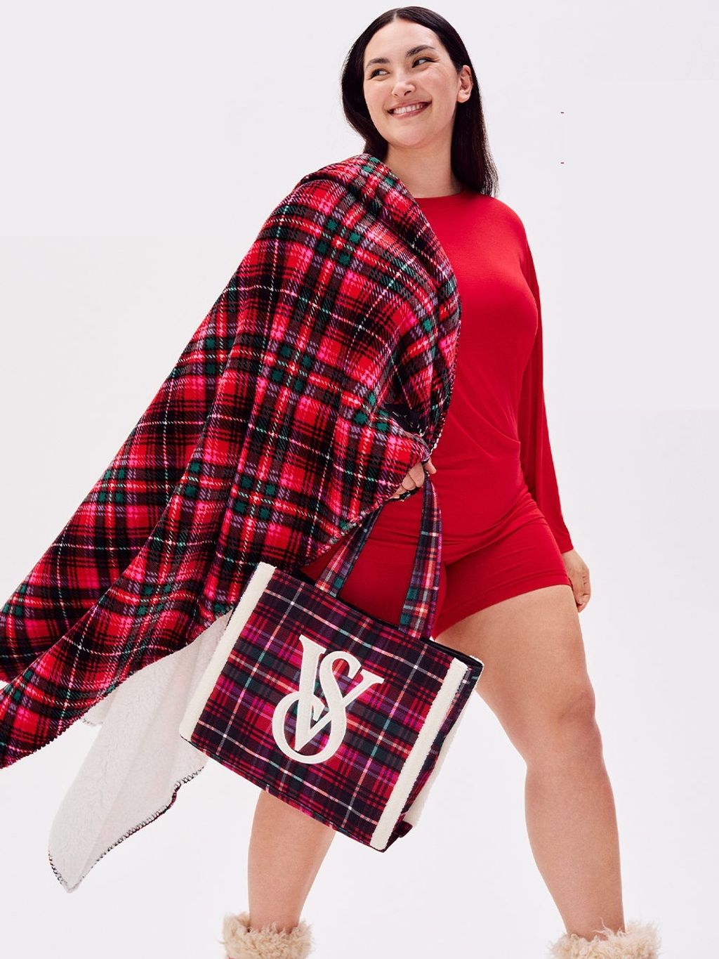 The most festive bag of them all. Our merry & bright tote features colorful tartan plaid, cozy fleece trim, and the VS monogram logo. Whether gifted or kept for yourself, it’s spacious enough to hold all sorts of everyday essentials—and adds a cheerful touch to any look.
