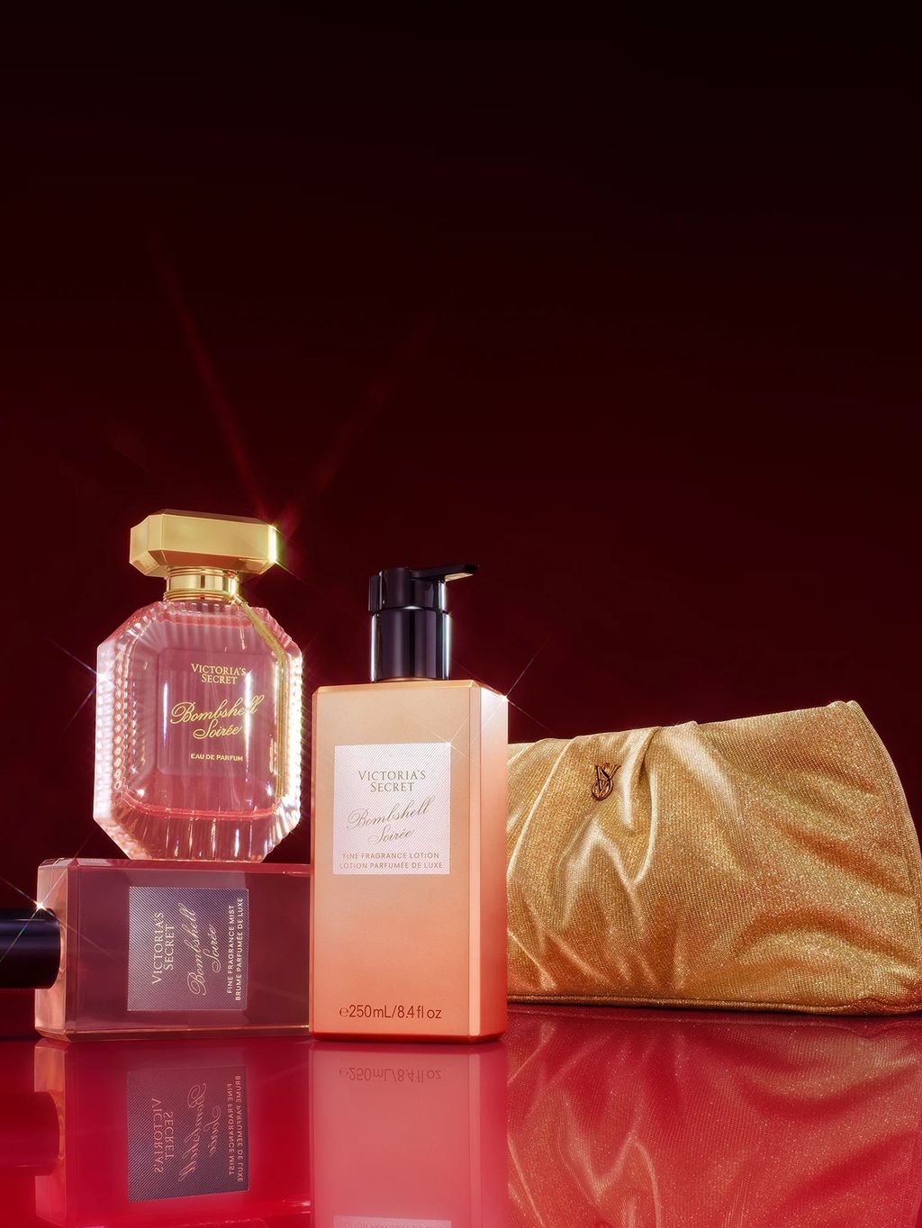 Alluring and decadent, Bombshell Soirée captures the radiance of holiday’s most fantastic fête. A fruity air of jeweled pear opens the fragrance. Velvet peony—a smooth take on Bombshell's distinctive floral essence—enters at the heart, then sparkling woods trails in at the base for a glimmering finish.