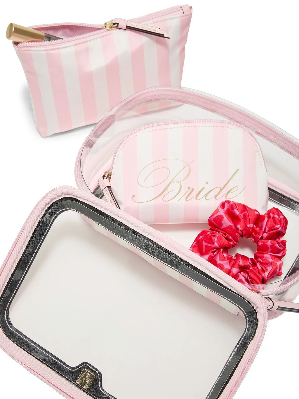 Here comes the glam. This iconic stripe trio fits everything you could ever need and the clear exterior helps you quickly find what you’re looking for. Features a beautiful bridal embroidery to celebrate your special day.